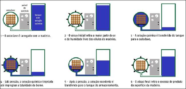 El preservante de la LINEA IMPREGNADA, conocido como CCA, está conformado por sales de cromo, cobre y arsénico. A continuación vea el proceso de impregnación.